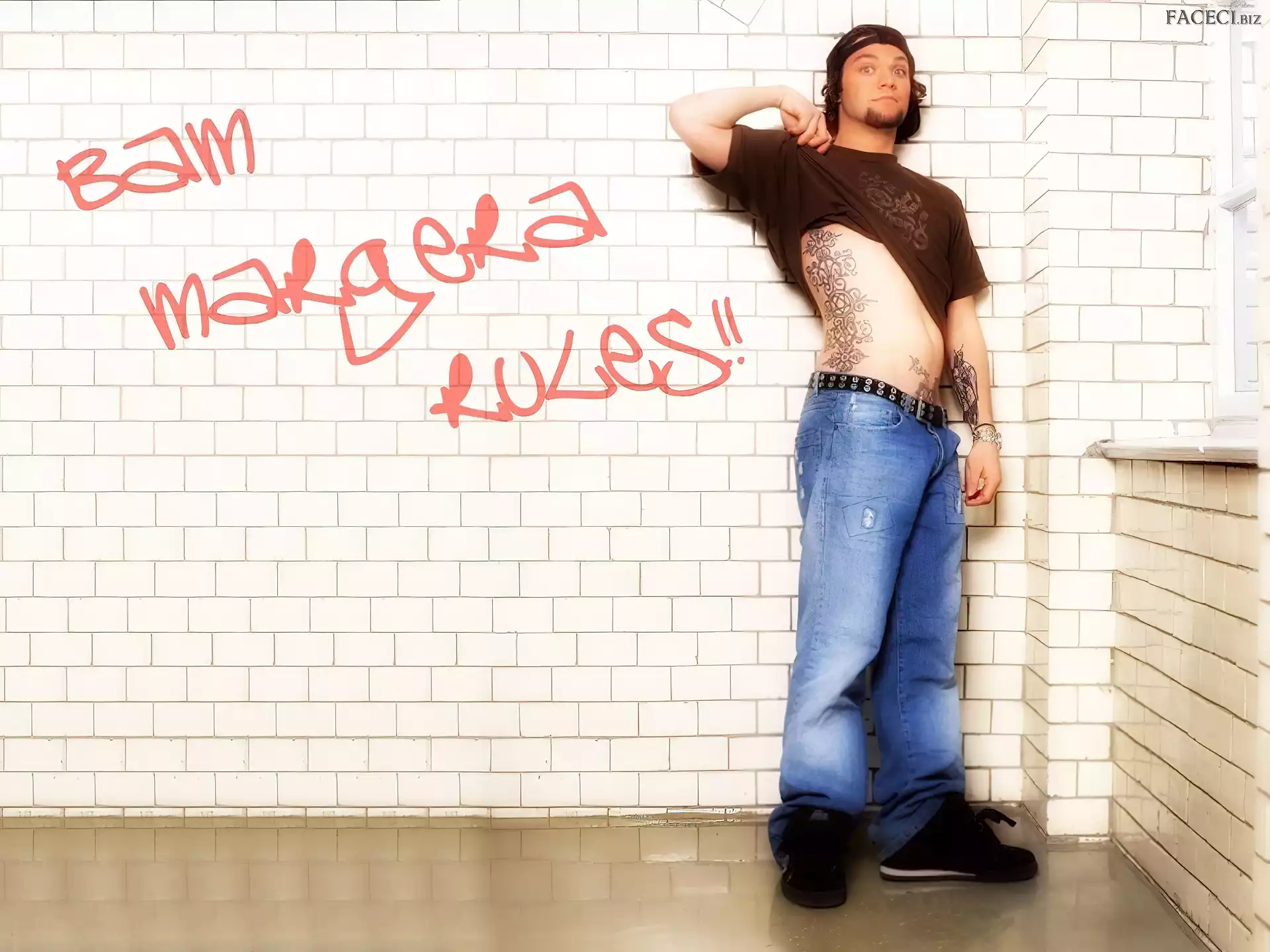 zegarek, Bam Margera, deskorolka okulary, Bam Margera, butelka włosy, Bam Margera, ciemne okulary, Bam Margera, twarze t-shirt, Bam Margera, brązowy kurtka, Bam Margera, rozpięta